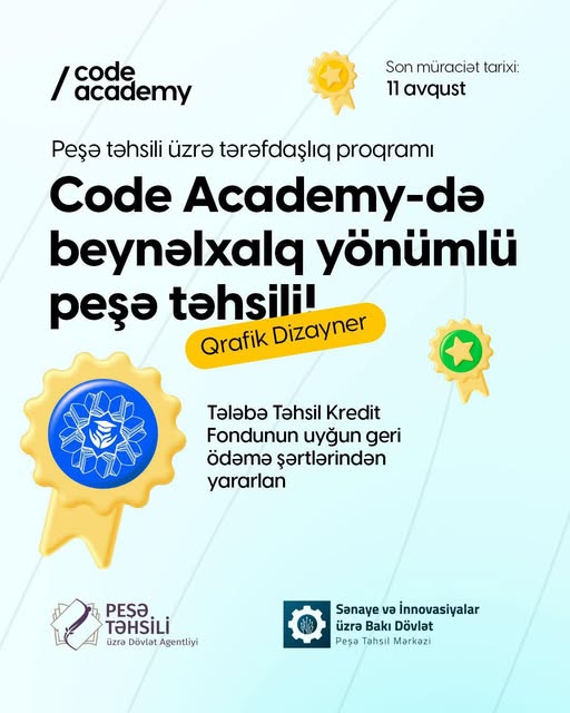 Code Academy və Peşə Təhsili üzrə Dövlət Agentliyinin əməkdaşlığı ilə təşkil olunan beynəlxalq yönümlü peşə təhsili proqramı çərçivəsində “Qrafik Dizayn” ixtisası üzrə qeydiyyat başladı.