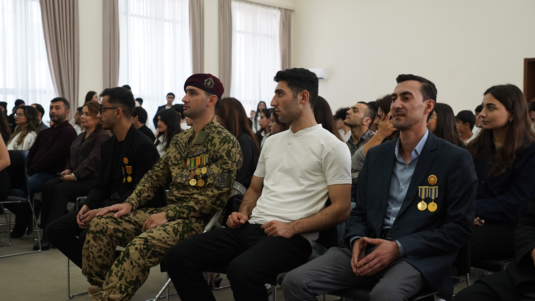 Milli qəhrəmanlarımızın və şəhidlərimizin əziz xatirəsi ehtiramla yad edilib. Mərkəzin qazi tələbəsi çıxış edərək döyüş xatirələrini bölüşüb, döyüş yoldaşları ilə birlikdə Vətən uğrunda apardıqları mübarizədən qürurla danışıb.